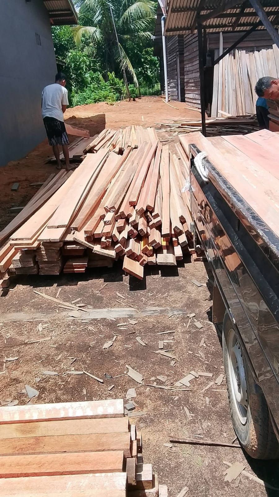 Unggahan yang diposting akun Facebook Power Pers memperlihatkan deretan kayu olahan dengan berbagai ukuran yang tersusun rapi di lahan terbuka.